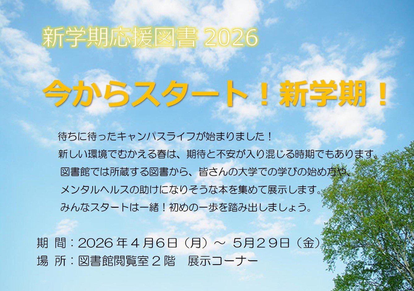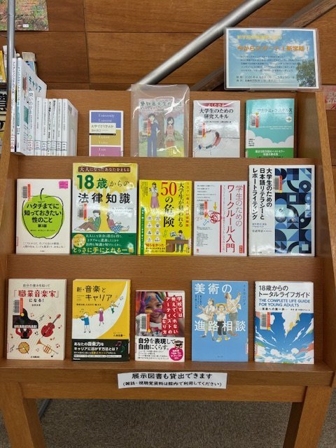 図書館では、新学期応援企画として、大学での学びの始め方やメンタルヘルスの助けになりそうな本を集めて展示します。