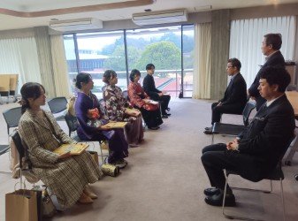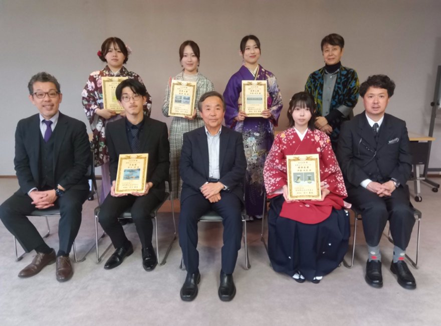 3月25日(水)には、制作者の芸術大学卒業生に対して、プロジェクトへの協力に感謝の意を表するため記念の盾を贈呈するとともに、古川理事長、川畑学長、白河愛知県立芸術大学学長との懇談を行いました。懇談では、作品の背景や見どころ、制作にあたって苦労した点などが制作者から披露され、理事長らと活発な意見交換がなされました。作品は図書館や特別講義棟など5か所に展示しています。ぜひご覧ください。