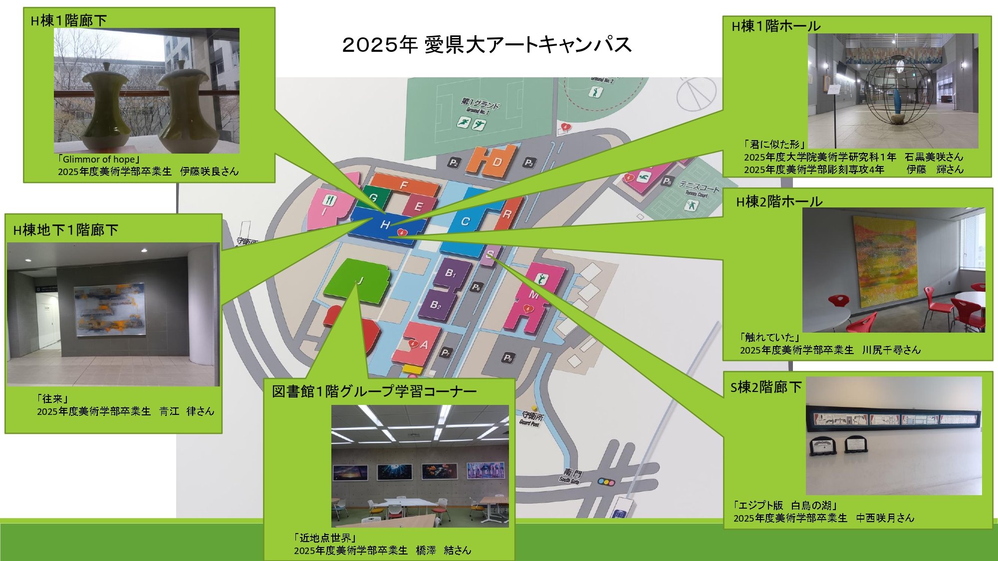 2025年度は、美術学部彫刻専攻の森北 伸教授の指導の下、大学院美術専攻の石黒 美咲さんと美術学部彫刻専攻の伊藤 輝さんが、H棟ホールにふさわしい作品を、県大生の現状をモチーフにして制作してくれました。また、2025年度愛知県立芸術大学卒業・修了制作展に出品された作品のうち、絵画やイラスト、陶磁器といった5作品をキャンパス内に展示しました。