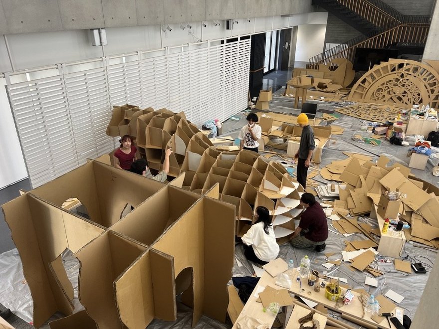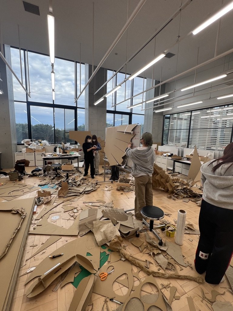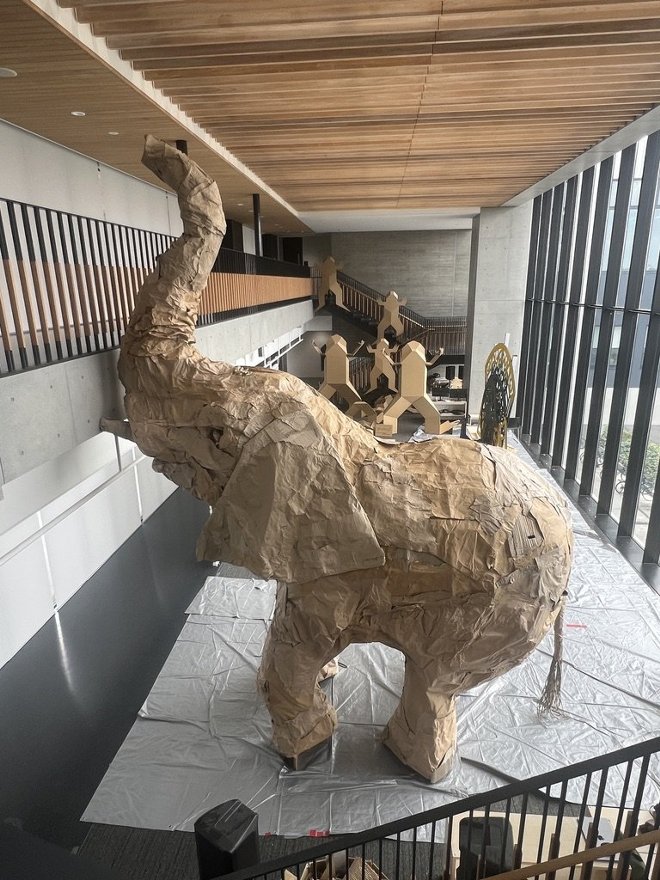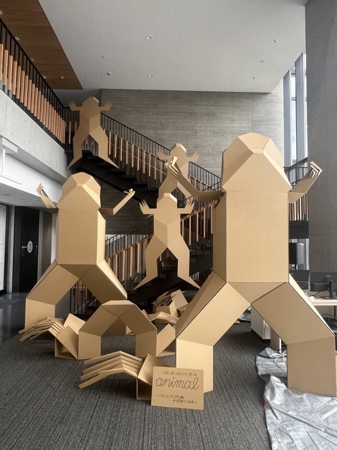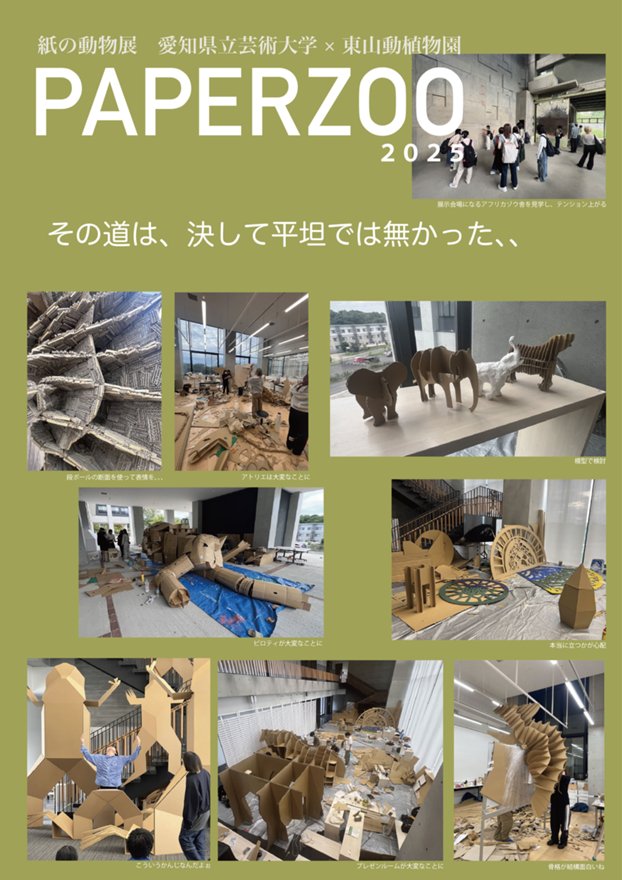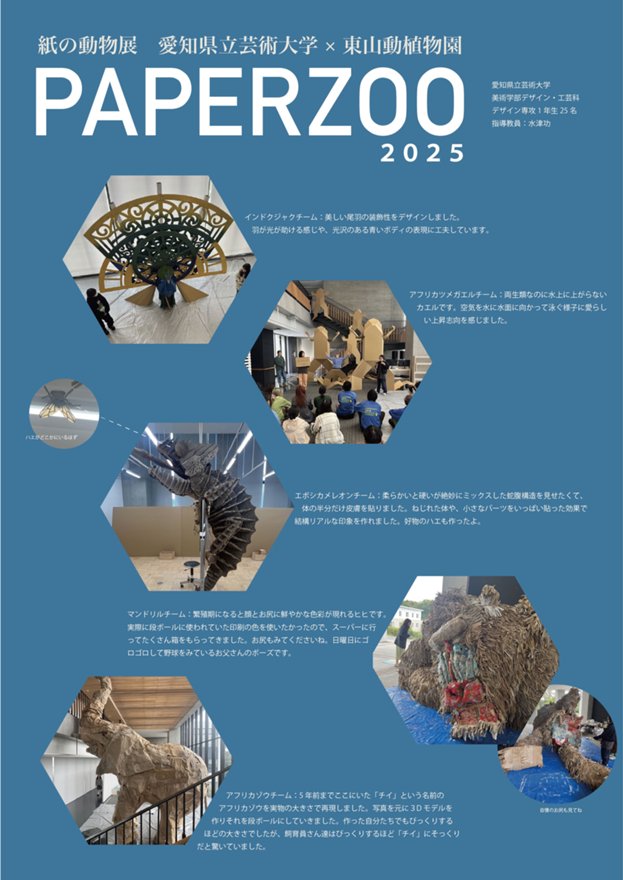 愛知県立芸術大学では、東山動植物園において産学官連携事業として「PAPER ZOO」を開催します。本学美術学部デザイン専攻1年生25名が東山動植物園の5種の動物をモチーフとして選定し、段ボール素材のみを用いて約1ヶ月かけて巨大な立体作品を制作しました。